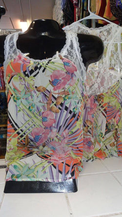 ![]() Poly/Spandex, Tie in back neck | ![]() Polyester-thin fabric in lace shoulder & halfway back | ![]() Polyester-thin fabric collared, button & tie |